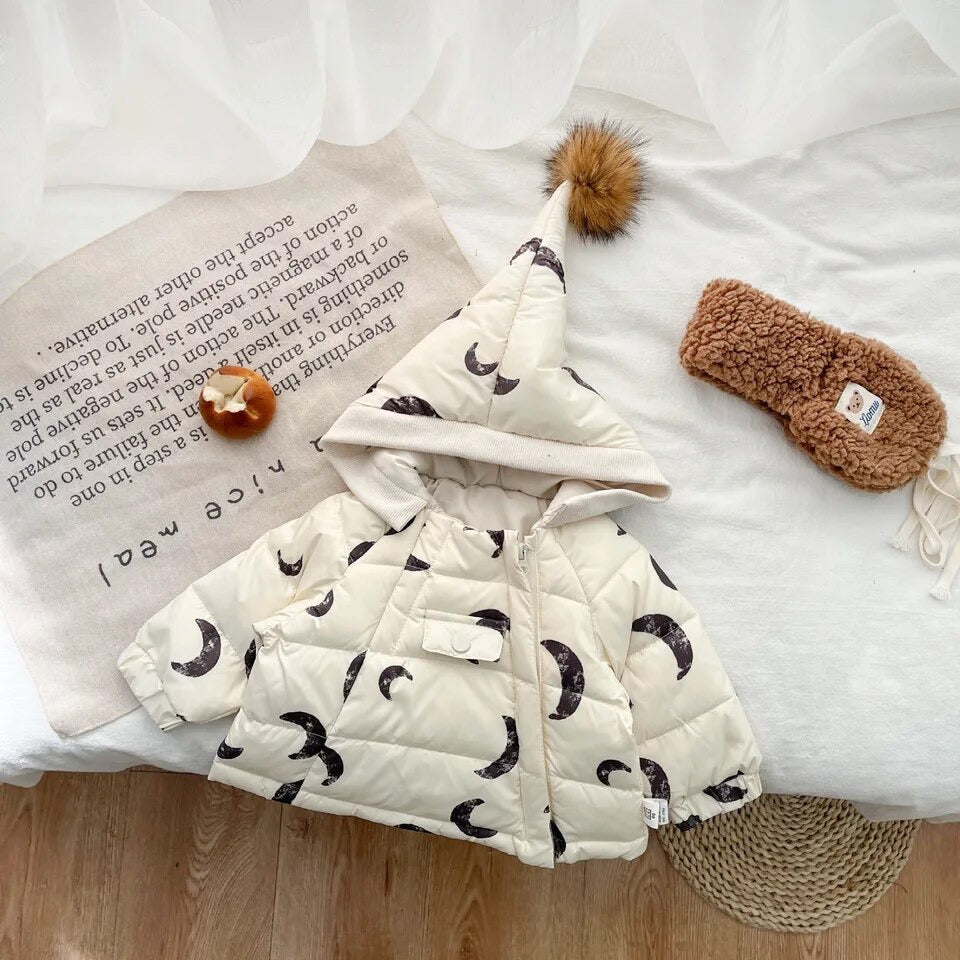Moon padded fleece lined jacket with faux fur pom pom hood.